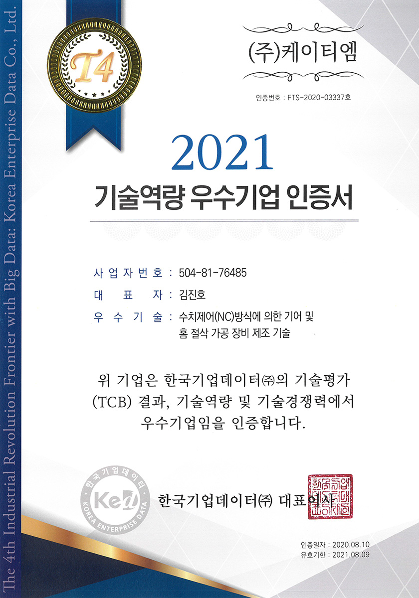 기술역량 우수기업 인증서